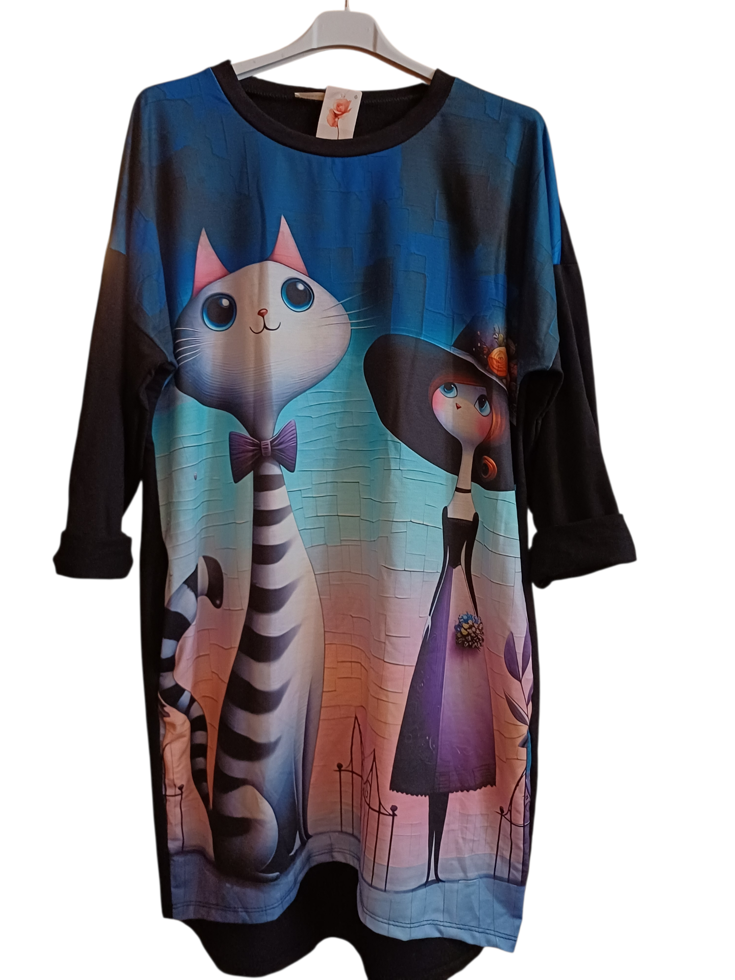 Krásné dámské šaty s kočičím designem. Rukávy jsou " spadlé", lze je ohnout. Rozměry: přes prsa max 120 cm, délka 100 cmMateriál : 95 % cotton+ 5 % elastan