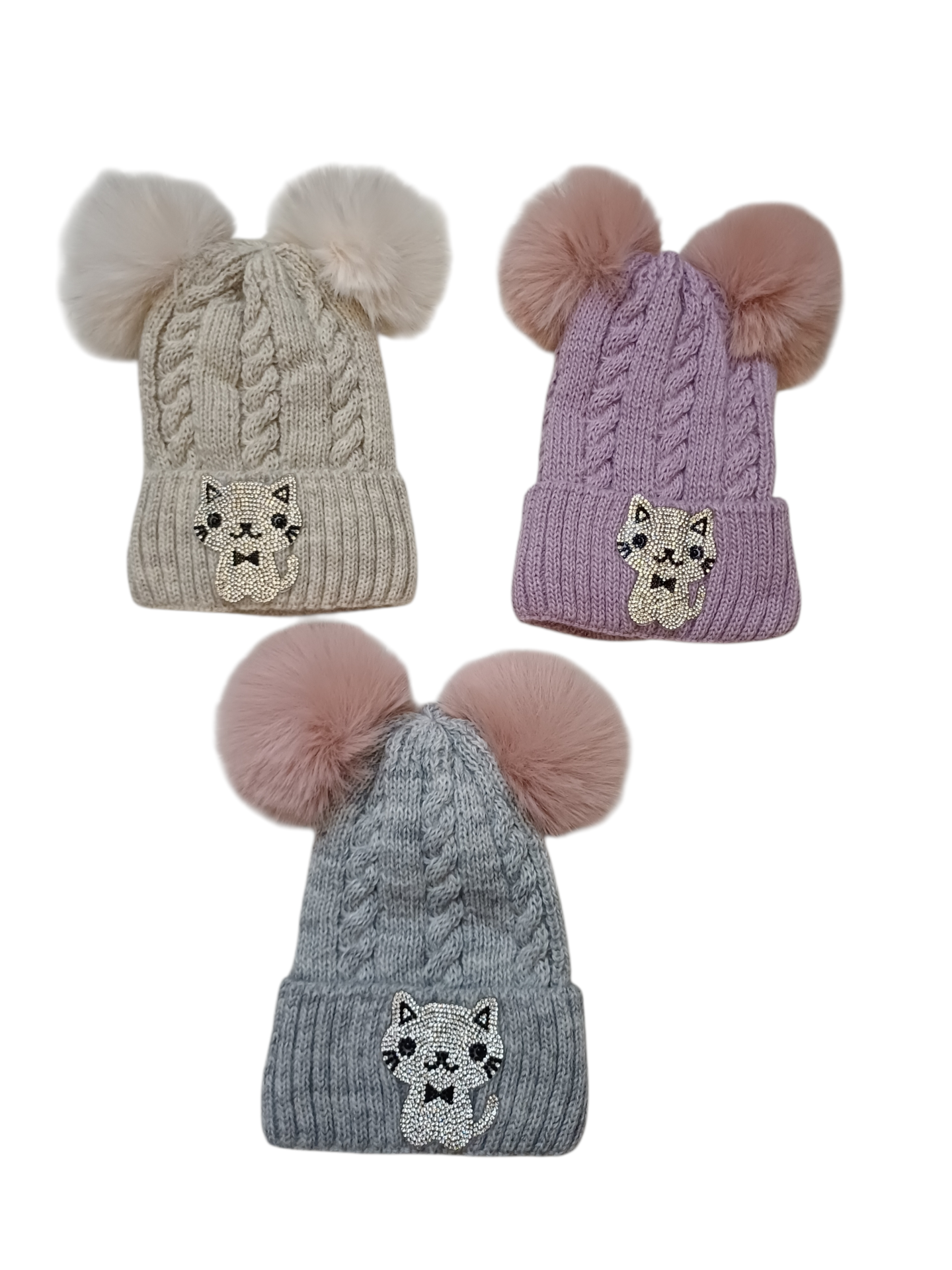 Dětská čepice s aplikací kočičky a 2 bambulemi. Čepice je pro max obvod hlavy 48 cm a to ve 3 barvách.materiál: 100% akryl