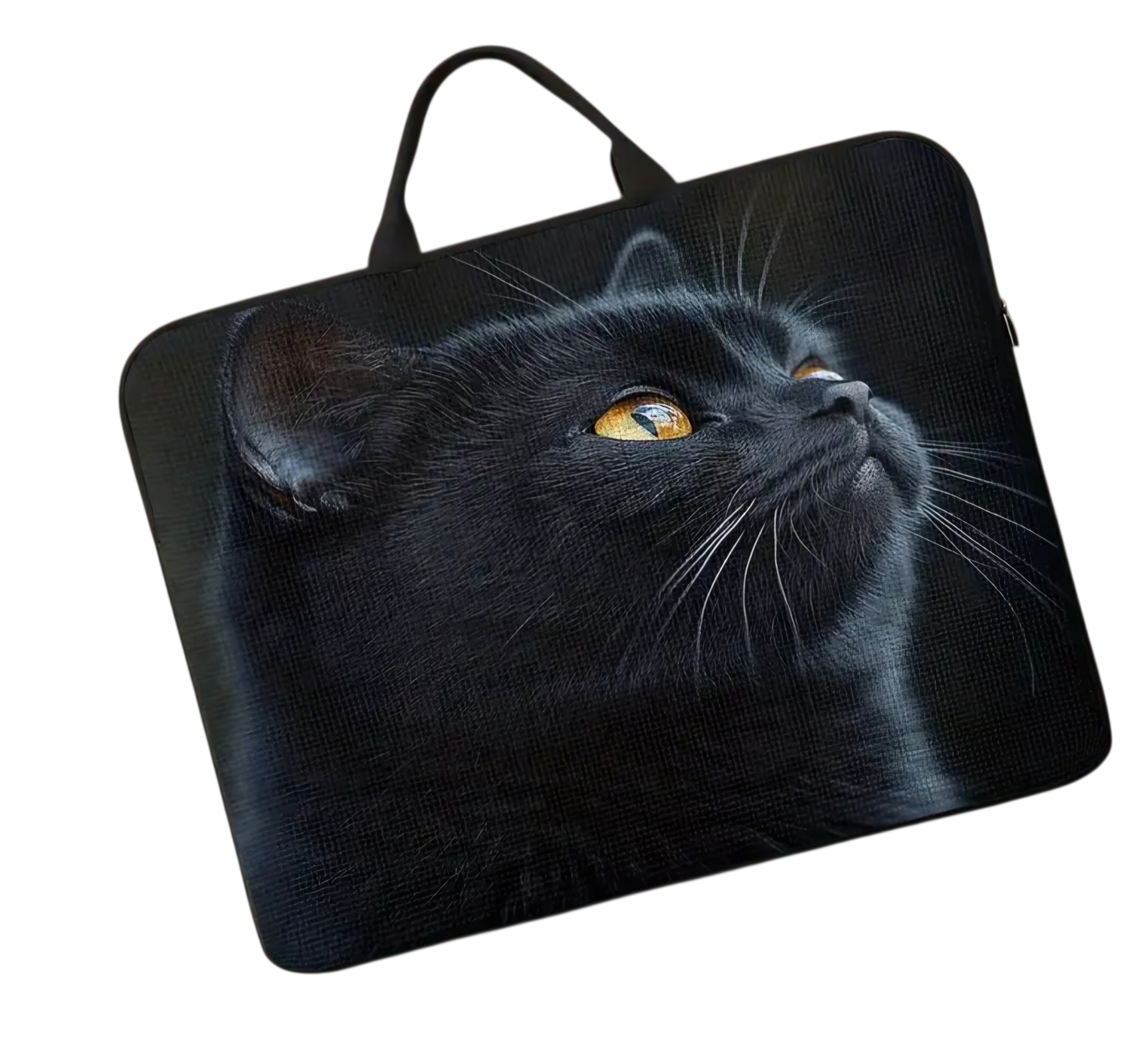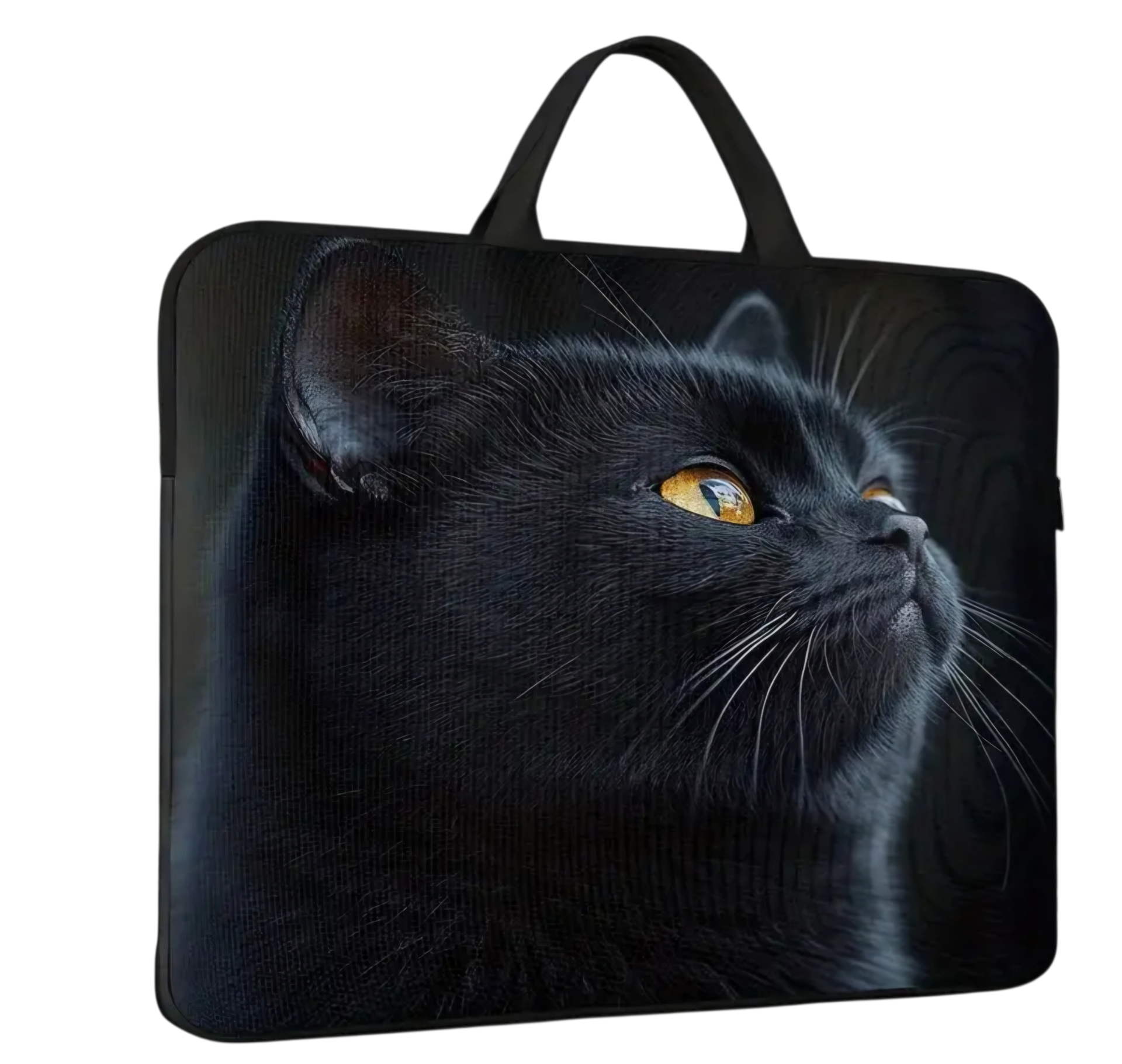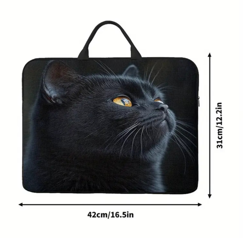 Stylová taška na notebook o rozměrech 42 cm × 31 cm, s potiskem kocoura z obou stran.Materiál: polyester
